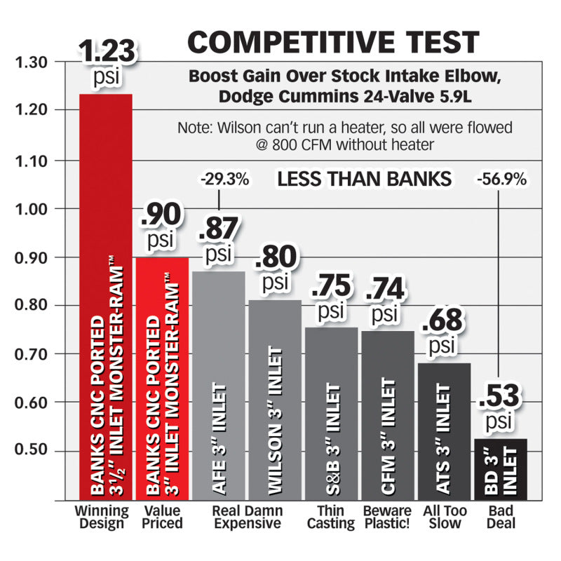 Monster-Ram raises boost without increasing backpressure at the turbine. Result: a more responsive, fuel-efficient engine. Up to six 1/8-inch NPT ports! At Banks Power, just enough is never enough when it comes to engine airflow. Maximum power, performance and efficiency are the ultimate goals, but to make it all happen the engine has to breathe freely and without needless restrictions. Finding ways to pump your engine full of cooler, denser air has always been the key. Our High-Ram intakes have always whipped the competition. Our new Monster-Ram flat-out destroys it. The Monster-Ram was designed using the latest in electronic computational fluid-dynamic technology, testing on the flow bench and dyno, and finally proven in the real world where the rubber meets the road. Monster-Ram is a beast that only Banks could have unleashed. With its simple, direct-replacement casting, Monster-Ram is instant power, performance, and acceleration gratification. It's the perfect upgrade whether you're just starting out or working to build a serious, purpose-built machine. With its up to six ports for pressure, temp, or flow sensors, the sky's the limit for performance expandability. Monster-Ram is CNC port-matched to the stock heater as well as the optional Banks Billet Intake Heater Delete spacer. Key Features: Raises boost without increasing turbine drive pressure. Out-boosts the competition by up to 56.9%. Larger and less restrictive than stock intake. Includes 3.5-inch mandrel-bent boost tube. Improves airflow from the intercooler. CNC port-matched for stock heater and Banks Billet Heater Delete. Up to six 1/8-inch NPT ports. Quicker throttle response. Delivers instant torque
